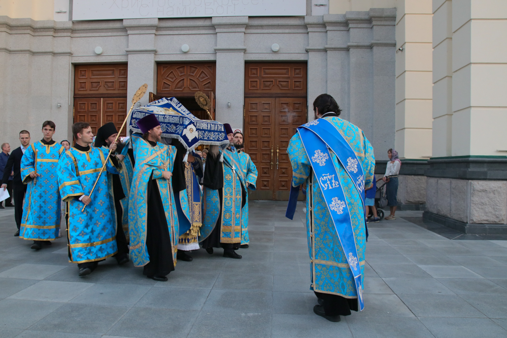 На полиелее из алтаря была вынесена плащаница с изображением Успения Божией Матери. После Великого славословия Глава Приамурской митрополии возглавил Крестный ход с плащаницей вокруг кафедрального собора.