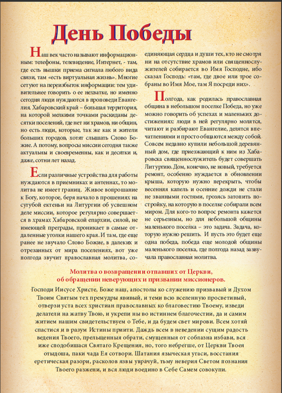 Полгода, как родилась православная община в небольшом поселке Победа, но уже можно говорить об успехах и маленьких достижениях: люди в ней регулярно молятся, читают и разбирают Евангелие, делятся впечатлениями и просто общаются между собой. Совсем недавно купили небольшой деревянный дом, где приезжающий к ним из Хабаровска священнослужитель будет совершать Литургию. Дом, конечно, не новый, требуется ремонт, особенно нуждается в обновлении крыша, которую нужно перекрыть, чтобы весенняя капель и осенние дожди не стали не званными гостями, грозясь затопить постройку, на которую в поселке собирали всем миром.