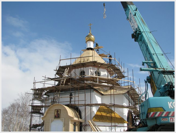 Установка нового купола на кладбищенскую часовню Петропавловска (31 марта 2008 года)